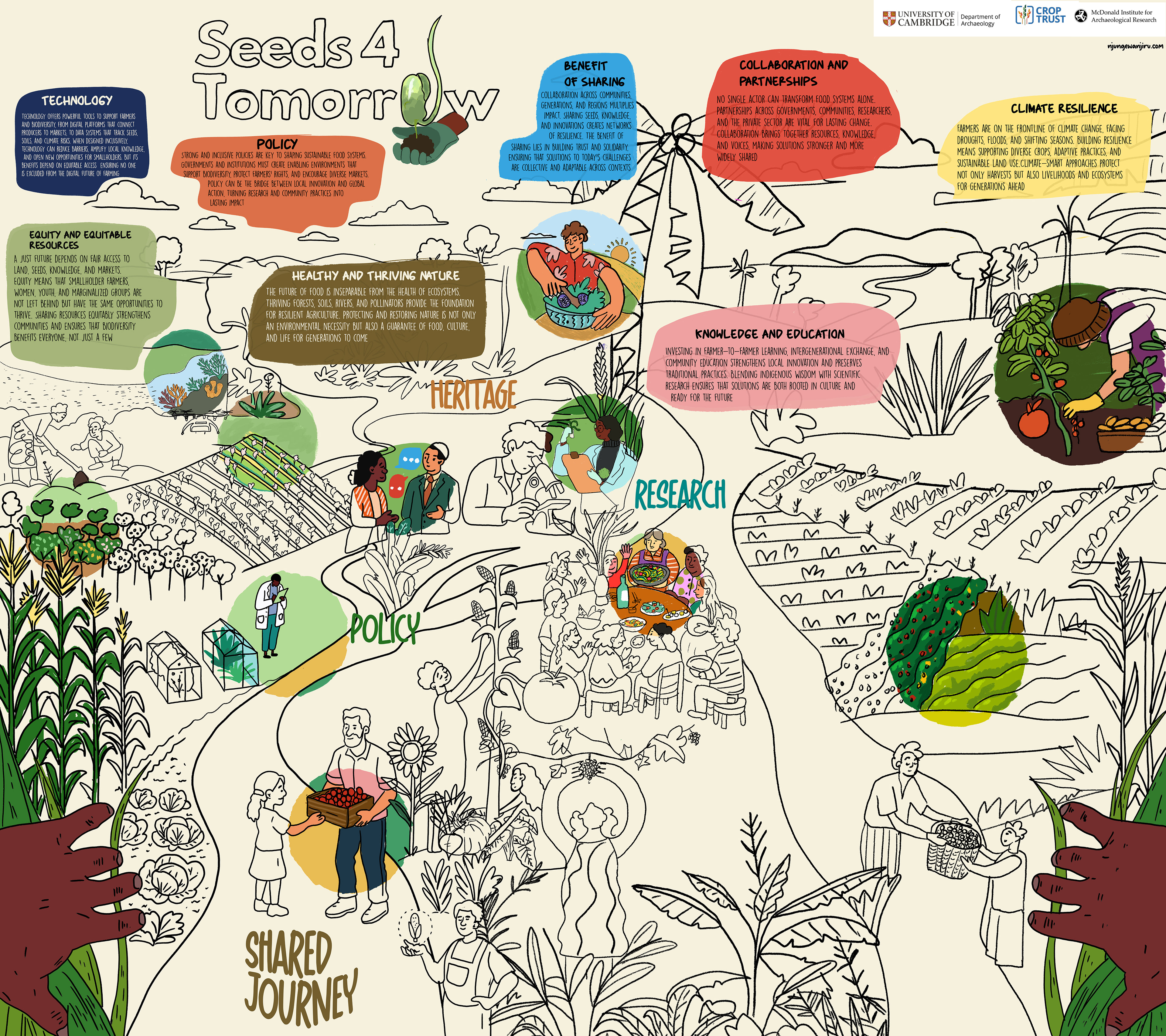 Visual notes from the Seeds for Tomorrow invited workshop at the McDonald Institute for Archaeological Research, University of Cambridge. The workshop brought together researchers, policymakers, and practitioners to explore the past, present, and future of crop diversity.